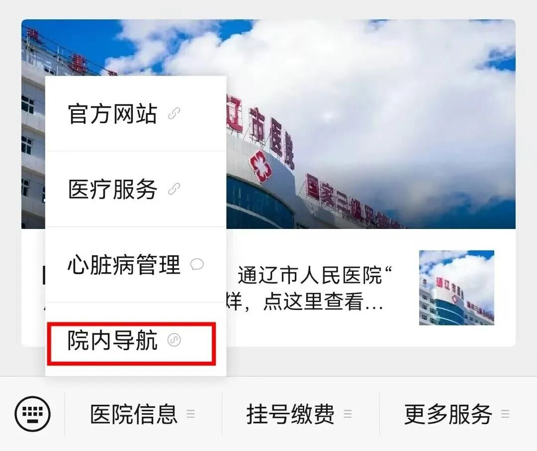 1.打开入口:通辽市人民医院微信公众号首页进入院内导航小程序,或抵达医院后,随处可见的宣导屏、立牌上均印有导航系统的二维码。只需打开手机微信“扫一扫”功能,对准二维码。