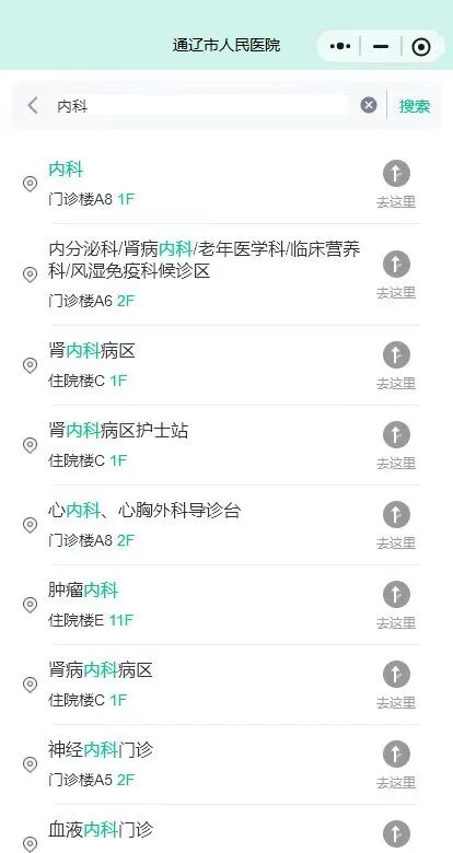 在页面上方的搜索框中,输入您要去的科室名称(如“心血管内科“、”三楼采血“、”卫生间“),支持模糊查询,系统会自动联想匹配。