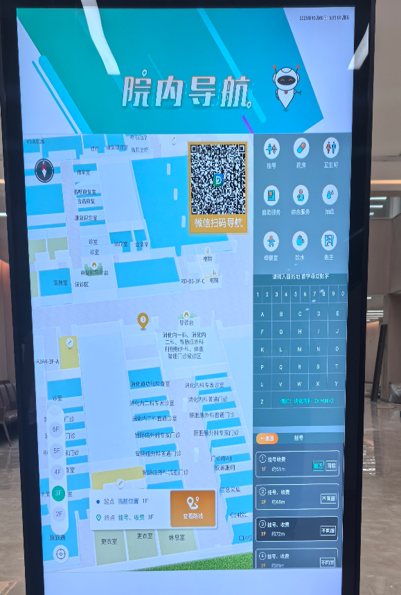 您也可以在门诊一楼大厅的导诊大屏处,搜索您要去的位置,可以模拟导航查看路径,也可以打开微信扫一扫功能,扫描屏幕上方的二维码,引导您的后续行进路径。